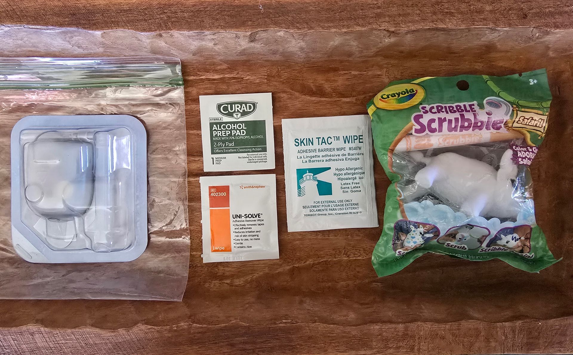 We put alcohol wipes, adhesive barrier wipes, and adhesive remover wipes with CGMs to make it easy to grab and go.